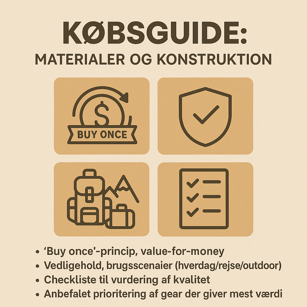 Godt gear handler ikke om at købe mest muligt, men om at købe rigtigt. Denne købsguide hjælper dig med at vurdere materialer og konstruktion, forstå “buy once”-princippet, finde ægte value-for-money og vælge udstyr, der passer til hverdag, rejse og outdoor.
